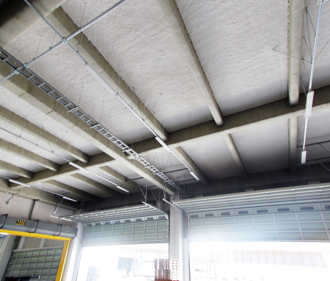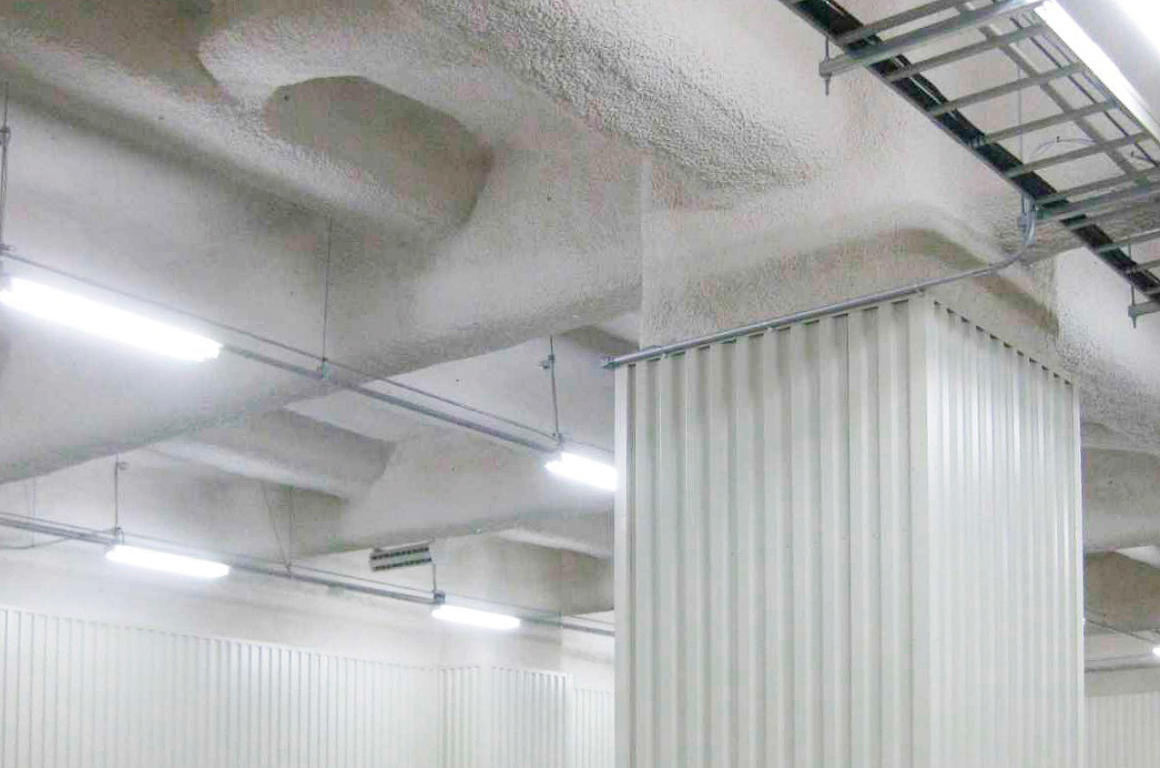 セラミライトエコGは不燃材料認定を取得しており、実火災を想定した過酷な拡大燃焼試験でも燃え拡がらない安全な湿式不燃断熱材です。断熱材を必要とする免震部やあらわしの天井・壁部などへの採用が増えています。