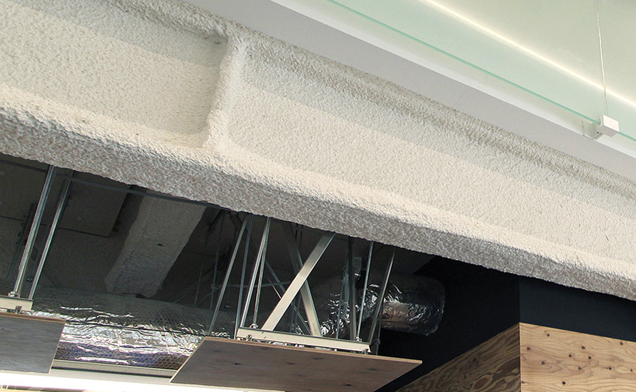 オフホワイトで明るい仕上がりの湿式セラミック系耐火被覆材です。鉄骨面への高い付着性や防錆性を有し、部位ごとに求められる平滑性(左官仕上げ)、クリアランスの確保、遮音、遮煙、結露対策といった課題に対応できることから、オフィス等のスケルトン天井、物流施設の車路・ランプウェイ、ホテル・住居、冷凍冷蔵倉庫、粉塵を嫌うデータセンターで採用が増えています。