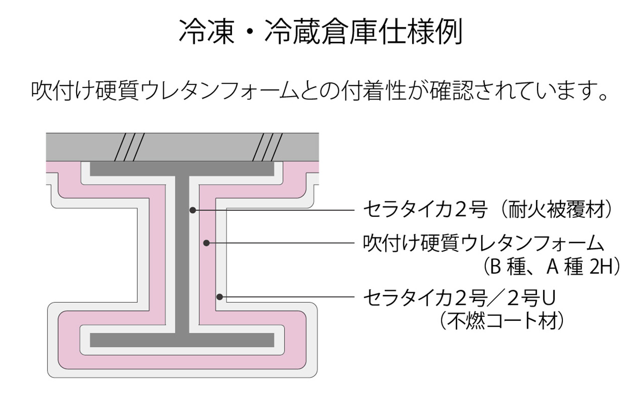 爆燃の危険性がある吹付け硬質ウレタンフォーム(JIS A 9526 A種1、B種、A種(1H,2H))の上に、セラタイカ2号・セラタイカ2号Uをわずか10mm程度の薄さで施工することにより、複合体不燃認定を取得しました。不燃要求部位へ最適な材料です。