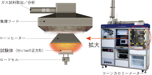 発熱性試験に加え、現場火災を想定した試験として有効であると評価される「模型箱試験」により、不燃性の確認を実施しています。「模型箱試験」は中間規模で室内を再現した試験で、着火→発熱→燃え拡がり→消火が同時進行している燃焼プロセスを再現しており、燃え拡がりを調べるのに適しています。